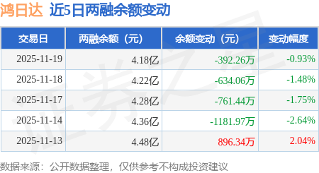 证券之星消息,11月19日,鸿日达(301285)融资买入1668.22万元,融资偿还2060.48万元,融资净卖出392.26万元,融资余额4.18亿元,近20个交易日中有14个交易日出现融资净买入。