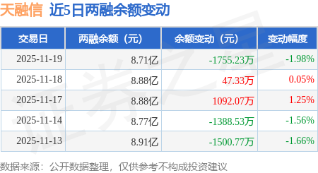 证券之星消息,11月19日,天融信(002212)融资买入3213.88万元,融资偿还4977.21万元,融资净卖出1763.34万元,融资余额8.67亿元,近20个交易日中有13个交易日出现融资净买入。