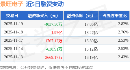 证券之星消息,11月19日,景旺电子(603228)融资买入1.83亿元,融资偿还2.24亿元,融资净卖出4037.5万元,融资余额17.86亿元。