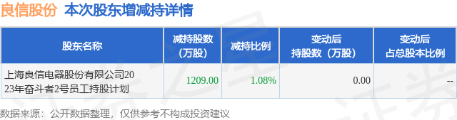 证券之星消息,11月20日良信股份发布公告《良信股份:关于奋斗者2号员工持股计划减持完毕的公告》,其股东上海良信电器股份有限公司2023年奋斗者2号员工持股计划于2025年11月7日至2025年11月19日间合计减持1209.0万股,占公司目前总股本的1.0765%,变动期间该股股价下跌12.14%,截止11月19日收盘报10.35元。