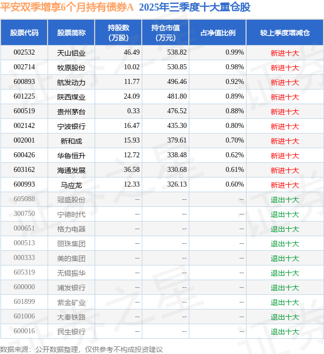 平安双季增享6个月持有债券A的前十大重仓股如下: