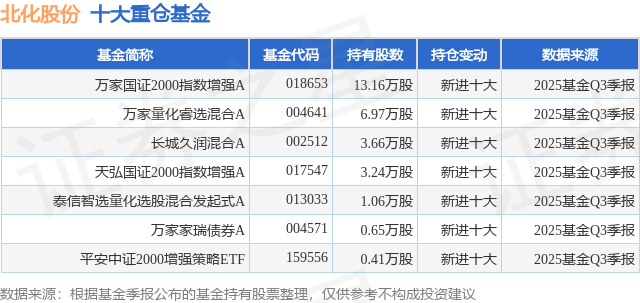根据2025基金Q3季报公募基金重仓股数据,重仓该股的公募基金共7家,其中持有数量最多的公募基金为万家基金的万家国证2000指数增强A。万家国证2000指数增强A目前规模为3.54亿元,最新净值1.3488(11月19日),较上一交易日下跌0.99%,近一年上涨36.41%。该公募基金现任基金经理为乔亮。乔亮在任的基金产品包括:万家量化睿选混合A,管理时间为2019年8月21日至今,期间收益率为57.62%;万家中证1000指数增强A,管理时间为2019年8月21日至今,期间收益率为123.01%;万家沪深300指数增强A,管理时间为2019年9月6日至今,期间收益率为45.98%;万家中证500指数增强A,管理时间为2019年9月6日至今,期间收益率为102.77%。