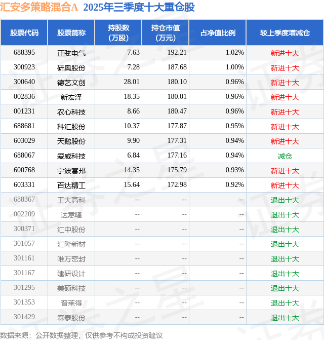 根据2025基金Q3季报公募基金重仓股数据,重仓该股的公募基金共3家,其中持有数量最多的公募基金为汇安基金的汇安多策略混合A。汇安多策略混合A目前规模为0.84亿元,最新净值1.6099(11月19日),较上一交易日下跌1.71%,近一年上涨46.85%。该公募基金现任基金经理为柳预才。柳预才在任的基金产品包括:汇安宜创量化精选混合A,管理时间为2020年12月30日至今,期间收益率为17.16%;汇安中证500增强A,管理时间为2022年12月23日至今,期间收益率为29.54%;汇安多因子混合A,管理时间为2023年5月29日至今,期间收益率为35.84%;