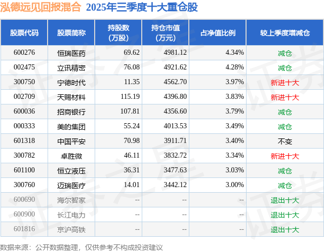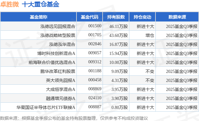 根据2025基金Q3季报公募基金重仓股数据,重仓该股的公募基金共15家,其中持有数量最多的公募基金为泓德基金的泓德远见回报混合。泓德远见回报混合目前规模为11.49亿元,最新净值1.7251(11月19日),较上一交易日上涨0.56%,近一年上涨11.71%。该公募基金现任基金经理为秦毅。秦毅在任的基金产品包括:泓德泓华混合,管理时间为2018年12月27日至今,期间收益率为224.64%;泓德战略转型股票,管理时间为2019年10月29日至今,期间收益率为89.76%;泓德睿泽混合,管理时间为2020年3月4日至今,期间收益率为22.3%;泓德睿源三年持有期混合,管理时间为2021年4月21日至今,期间收益率为-28.33%。