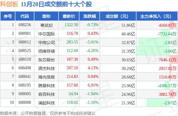 当日科创板成交额前10大个股中5只个股收涨,平均涨幅2.56%,其中寒武纪(688256)以成交额51.86亿元排第一。从主力资金流入看,成交额前10大个股中有5只个股呈现主力资金净流入。