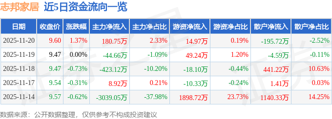 证券之星消息,截至2025年11月20日收盘,志邦家居(603801)报收于9.6元,上涨1.37%,换手率1.87%,成交量8.11万手,成交额7759.6万元。