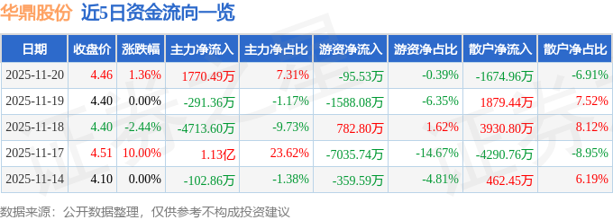 证券之星消息,截至2025年11月20日收盘,华鼎股份(601113)报收于4.46元,上涨1.36%,换手率4.96%,成交量54.71万手,成交额2.42亿元。