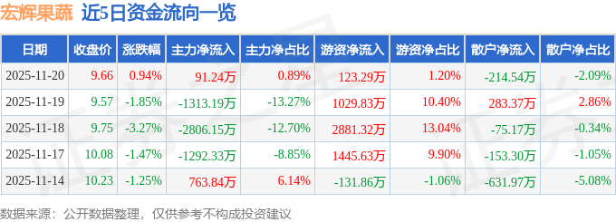证券之星消息,截至2025年11月20日收盘,宏辉果蔬(603336)报收于9.66元,上涨0.94%,换手率1.75%,成交量10.65万手,成交额1.03亿元。