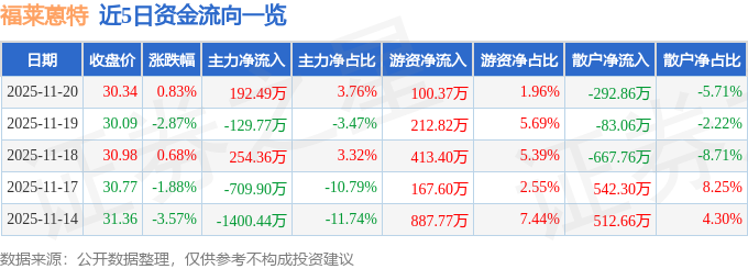 证券之星消息,截至2025年11月20日收盘,福莱蒽特(605566)报收于30.34元,上涨0.83%,换手率1.27%,成交量1.69万手,成交额5125.94万元。