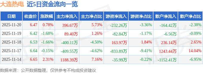 证券之星消息,截至2025年11月20日收盘,大连热电(600719)报收于6.47元,上涨0.78%,换手率2.64%,成交量10.7万手,成交额6921.77万元。