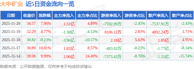 证券之星消息,截至2025年11月20日收盘,大中矿业(001203)报收于34.57元,上涨7.06%,换手率6.94%,成交量89.53万手,成交额30.96亿元。
