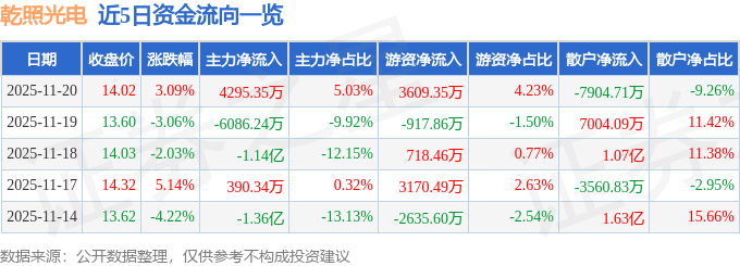 证券之星消息,截至2025年11月20日收盘,乾照光电(300102)报收于14.02元,上涨3.09%,换手率6.65%,成交量60.92万手,成交额8.54亿元。