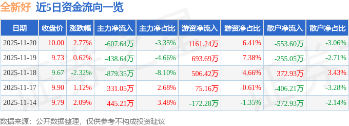 11月20日的资金流向数据方面,主力资金净流出607.64万元,占总成交额3.35%,游资资金净流入1161.24万元,占总成交额6.41%,散户资金净流出553.6万元,占总成交额3.06%。