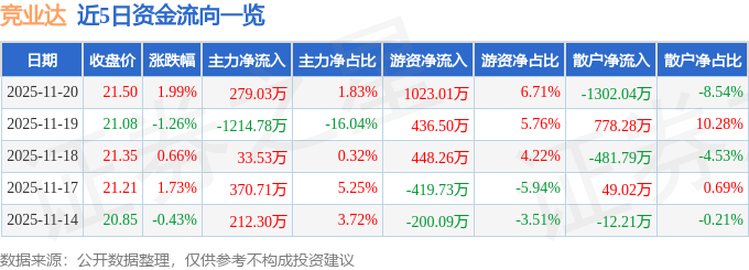 证券之星消息,截至2025年11月20日收盘,竞业达(003005)报收于21.5元,上涨1.99%,换手率5.6%,成交量7.11万手,成交额1.53亿元。