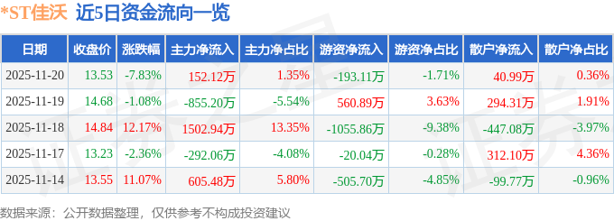 证券之星消息,截至2025年11月20日收盘,*ST佳沃(300268)报收于13.53元,下跌7.83%,换手率6.06%,成交量8.1万手,成交额1.13亿元。
