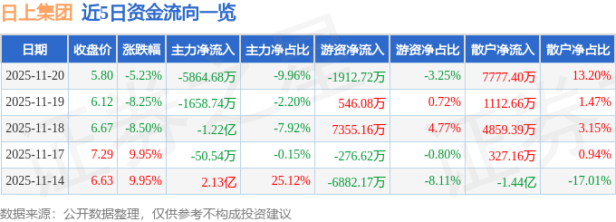 证券之星消息,截至2025年11月20日收盘,日上集团(002593)报收于5.8元,下跌5.23%,换手率17.88%,成交量99.9万手,成交额5.89亿元。