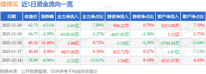 证券之星消息,截至2025年11月20日收盘,值得买(300785)报收于42.73元,下跌4.51%,换手率24.24%,成交量29.66万手,成交额12.83亿元。