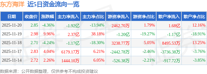 证券之星消息,截至2025年11月20日收盘,东方海洋(002086)报收于2.85元,下跌4.36%,换手率28.18%,成交量445.64万手,成交额13.8亿元。