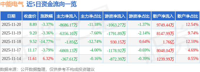 证券之星消息,截至2025年11月20日收盘,中能电气(300062)报收于8.89元,下跌3.37%,换手率22.29%,成交量86.08万手,成交额7.77亿元。