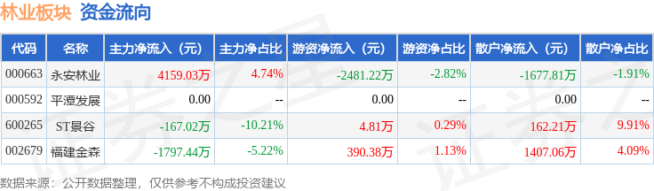 从资金流向上来看,当日林业板块主力资金净流入2194.57万元,游资资金净流出2086.02万元,散户资金净流出108.55万元。林业板块个股资金流向见下表: