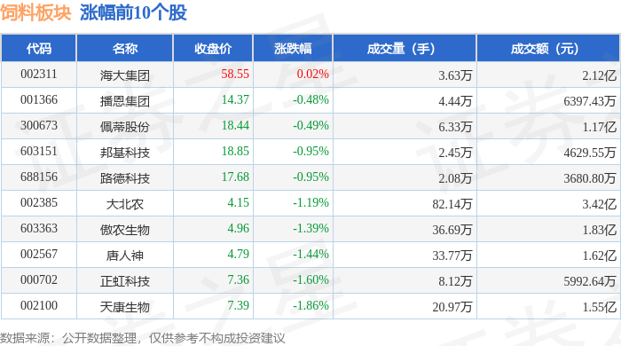 证券之星消息,11月20日饲料板块较上一交易日下跌1.6%,天马科技领跌。当日上证指数报收于3931.05,下跌0.4%。深证成指报收于12980.82,下跌0.76%。饲料板块个股涨跌见下表: