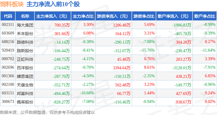 从资金流向上来看,当日饲料板块主力资金净流出4.98亿元,游资资金净流入2.59亿元,散户资金净流入2.39亿元。饲料板块个股资金流向见下表:
