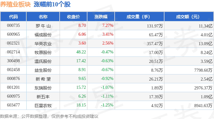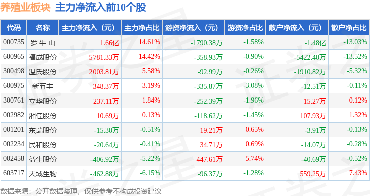 从资金流向上来看,当日养殖业板块主力资金净流出4759.27万元,游资资金净流入1.09亿元,散户资金净流出6095.85万元。养殖业板块个股资金流向见下表: