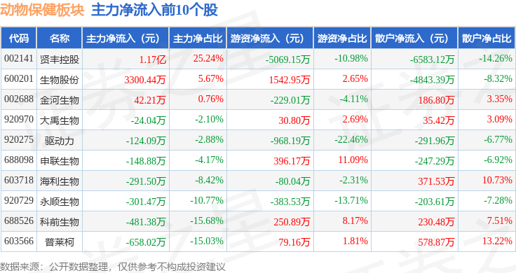 从资金流向上来看,当日动物保健板块主力资金净流入8881.31万元,游资资金净流出1461.46万元,散户资金净流出7419.85万元。动物保健板块个股资金流向见下表: