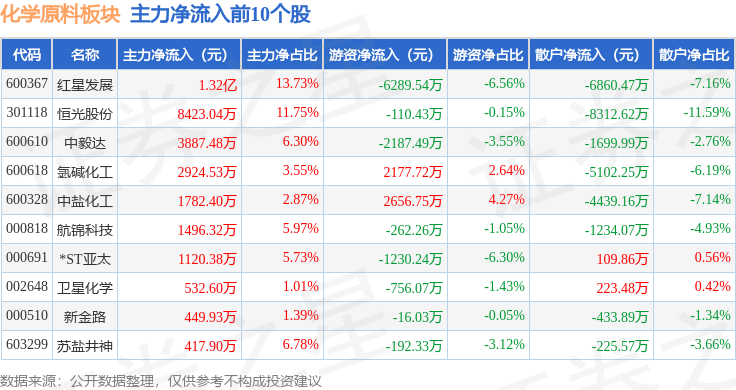 从资金流向上来看,当日化学原料板块主力资金净流出7.45亿元,游资资金净流入5890.82万元,散户资金净流入6.86亿元。化学原料板块个股资金流向见下表: