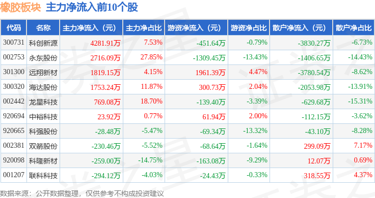 从资金流向上来看,当日橡胶板块主力资金净流入882.24万元,游资资金净流入7598.41万元,散户资金净流出8480.64万元。橡胶板块个股资金流向见下表: