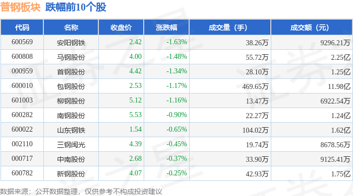 证券之星消息,11月20日普钢板块较上一交易日下跌0.3%,安阳钢铁领跌。当日上证指数报收于3931.05,下跌0.4%。深证成指报收于12980.82,下跌0.76%。普钢板块个股涨跌见下表: