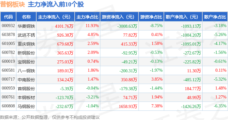 从资金流向上来看,当日普钢板块主力资金净流出2.6亿元,游资资金净流入7523.13万元,散户资金净流入1.84亿元。普钢板块个股资金流向见下表: