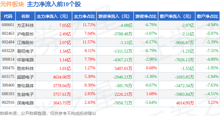 从资金流向上来看,当日元件板块主力资金净流入10.05亿元,游资资金净流出4.12亿元,散户资金净流出5.94亿元。元件板块个股资金流向见下表: