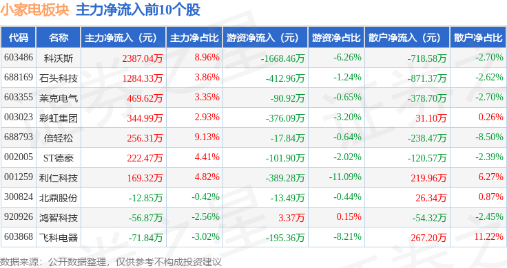 从资金流向上来看,当日小家电板块主力资金净流出1276.85万元,游资资金净流出5846.32万元,散户资金净流入7123.17万元。小家电板块个股资金流向见下表: