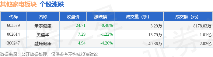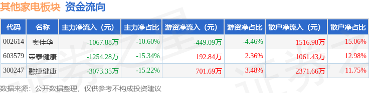 从资金流向上来看,当日其他家电板块主力资金净流出5395.51万元,游资资金净流入445.45万元,散户资金净流入4950.07万元。其他家电板块个股资金流向见下表: