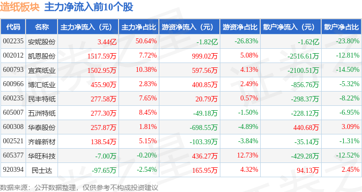 从资金流向上来看,当日造纸板块主力资金净流入1.91亿元,游资资金净流出1.32亿元,散户资金净流出5939.86万元。造纸板块个股资金流向见下表: