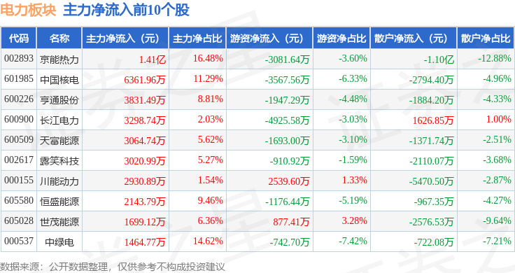 从资金流向上来看,当日电力板块主力资金净流出6.21亿元,游资资金净流入2.26亿元,散户资金净流入3.95亿元。电力板块个股资金流向见下表: