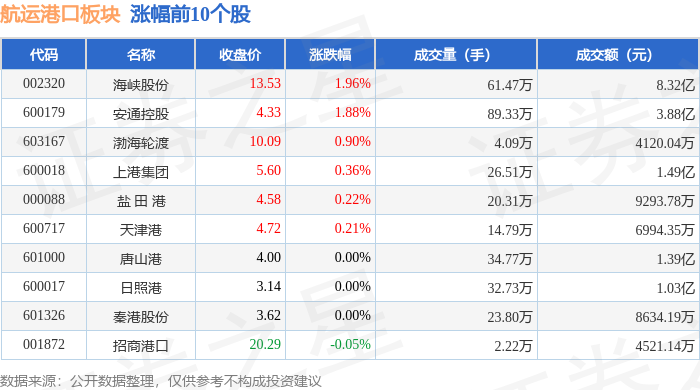 证券之星消息,11月20日航运港口板块较上一交易日下跌0.88%,海通发展领跌。当日上证指数报收于3931.05,下跌0.4%。深证成指报收于12980.82,下跌0.76%。航运港口板块个股涨跌见下表: