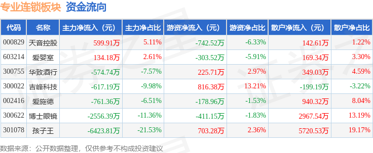 从资金流向上来看,当日专业连锁板块主力资金净流出1.02亿元,游资资金净流入109.22万元,散户资金净流入1.01亿元。专业连锁板块个股资金流向见下表: