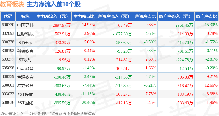 从资金流向上来看,当日教育板块主力资金净流出8280.1万元,游资资金净流出614.71万元,散户资金净流入8894.81万元。教育板块个股资金流向见下表: