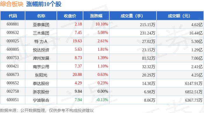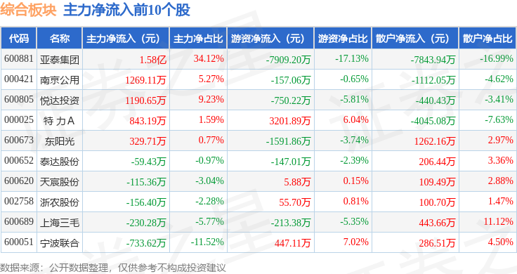 从资金流向上来看,当日综合板块主力资金净流出4533.37万元,游资资金净流出3865.21万元,散户资金净流入8398.58万元。综合板块个股资金流向见下表:
