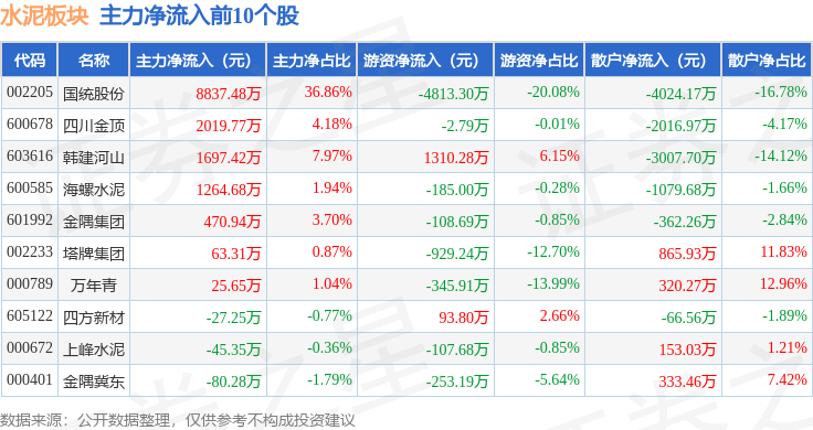从资金流向上来看,当日水泥板块主力资金净流出3372.27万元,游资资金净流出2178.3万元,散户资金净流入5550.57万元。水泥板块个股资金流向见下表: