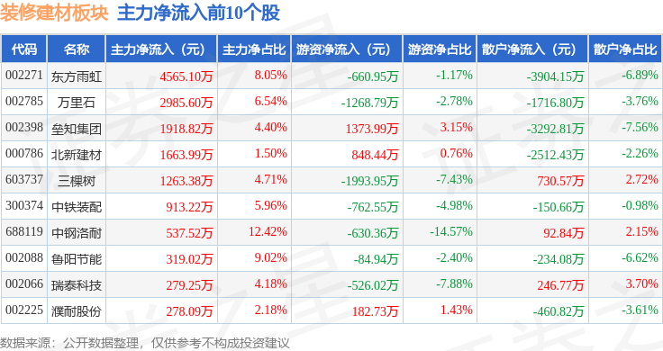 从资金流向上来看,当日装修建材板块主力资金净流出3224.61万元,游资资金净流出246.67万元,散户资金净流入3471.27万元。装修建材板块个股资金流向见下表: