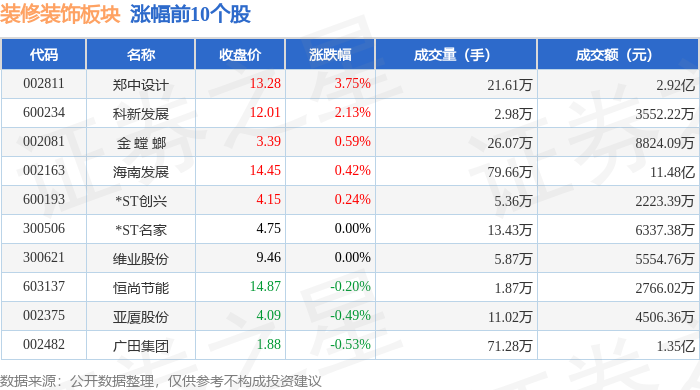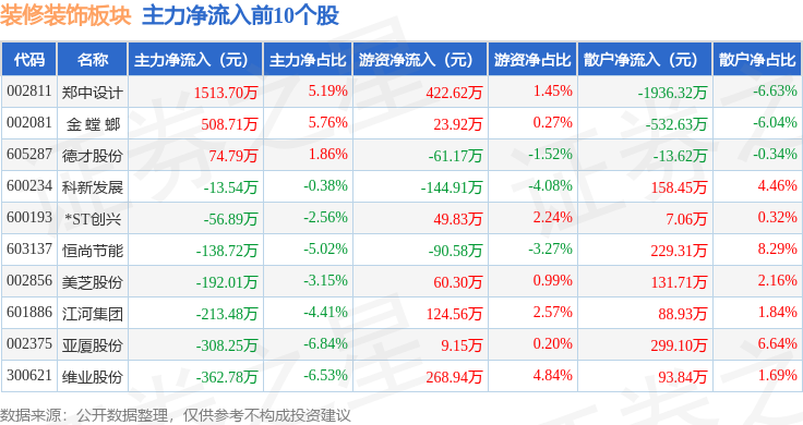 从资金流向上来看,当日装修装饰板块主力资金净流出2.48亿元,游资资金净流入4497.02万元,散户资金净流入2.03亿元。装修装饰板块个股资金流向见下表:
