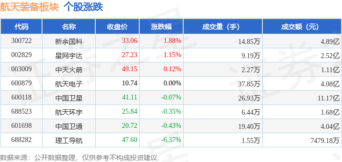 证券之星消息,11月20日航天装备板块较上一交易日下跌0.24%,理工导航领跌。当日上证指数报收于3931.05,下跌0.4%。深证成指报收于12980.82,下跌0.76%。航天装备板块个股涨跌见下表: