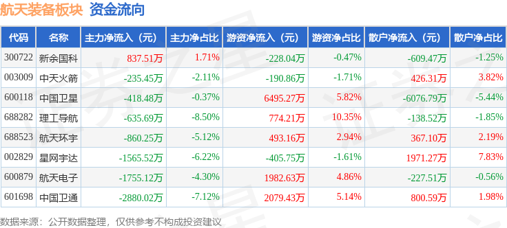 从资金流向上来看,当日航天装备板块主力资金净流出7513.03万元,游资资金净流入1.1亿元,散户资金净流出3487.03万元。航天装备板块个股资金流向见下表: