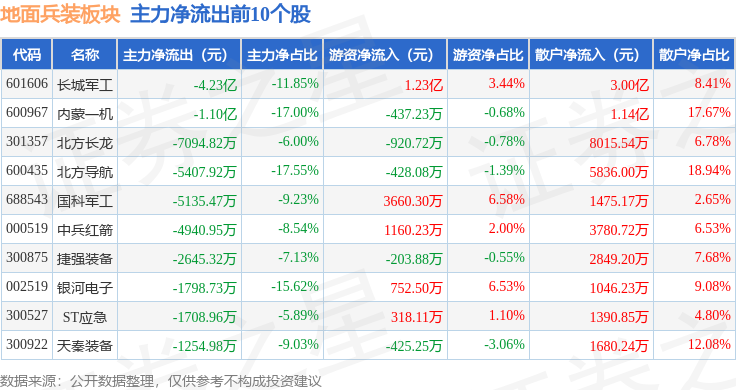 从资金流向上来看,当日地面兵装板块主力资金净流出8.36亿元,游资资金净流入1.57亿元,散户资金净流入6.79亿元。地面兵装板块个股资金流向见下表: