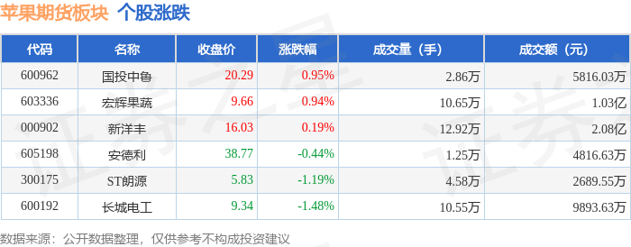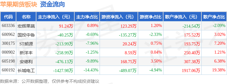 从资金流向上来看,当日苹果期货板块主力资金净流出2326.11万元,游资资金净流出303.45万元,散户资金净流入2629.56万元。苹果期货板块个股资金流向见下表:
