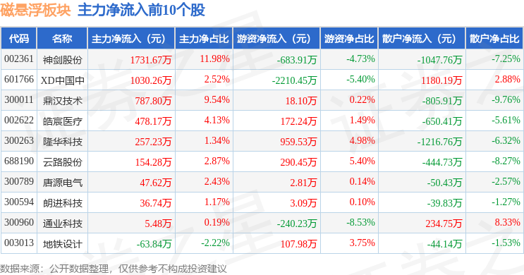 从资金流向上来看,当日磁悬浮板块主力资金净流出12.93亿元,游资资金净流入2.3亿元,散户资金净流入10.63亿元。磁悬浮板块个股资金流向见下表: