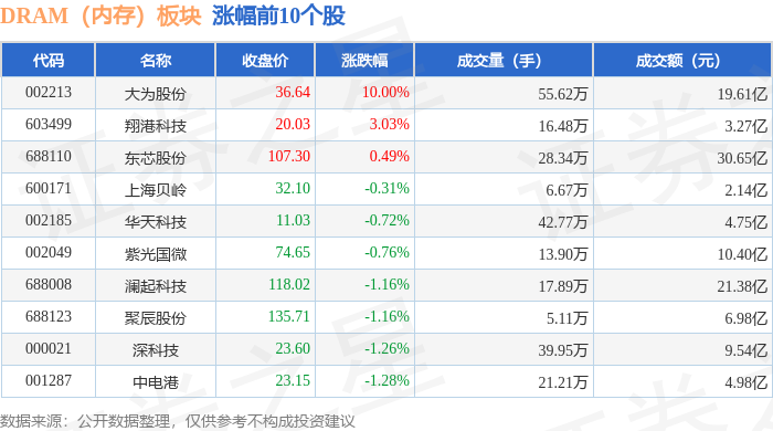 从资金流向上来看,当日DRAM(内存)板块主力资金净流出39.71亿元,游资资金净流入4.37亿元,散户资金净流入35.34亿元。DRAM(内存)板块个股资金流向见下表: